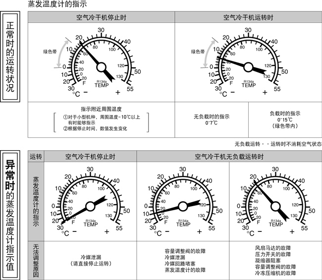 請確認冷干燥機運行時蒸發溫度計的指示在綠色范圍內。